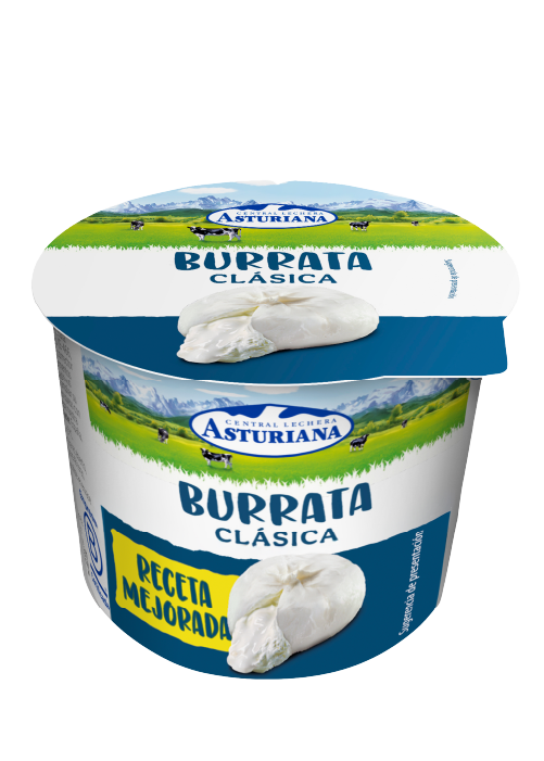 Central Lechera Asturiana Classic Burrata 150 g is crafted through a careful production process. First, a ball of stretched curd, similar to mozzarella, is formed and then filled with Stracciatella, a mixture of cream and mozzarella strands. Each Burrata is then hand-sealed, giving it its characteristic “pouch” shape.